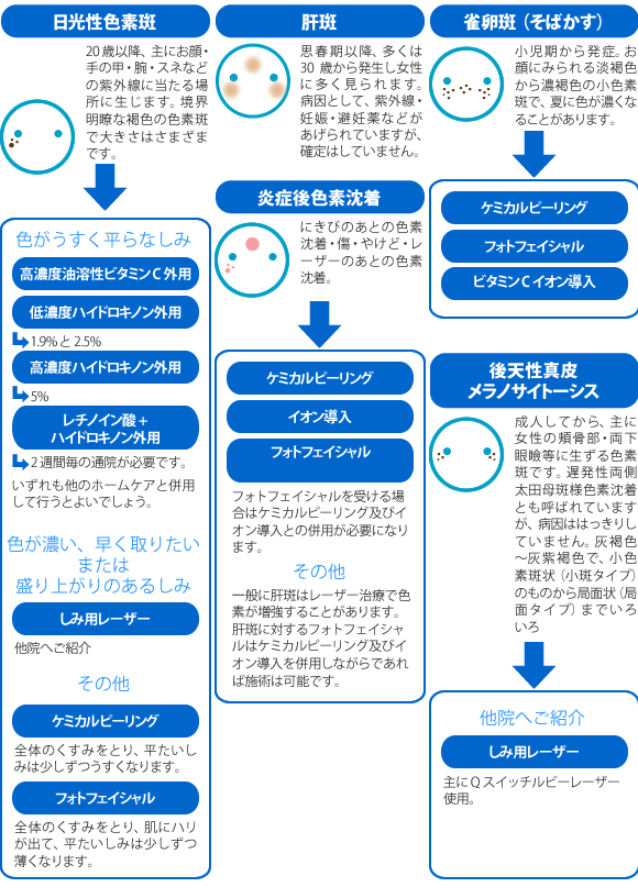 しみの部分には高濃度のVC誘導体化粧品を用いたり、しみの種類によってはハイドロキノン、レチノイン酸等を用いる場合もあります。